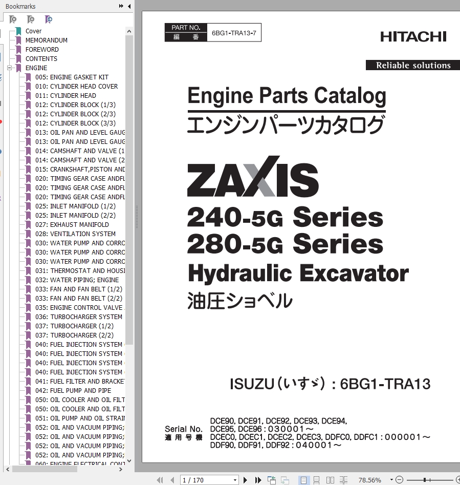 Hitachi ZX240-5G ZX280-5G Engine Parts Catalog 6BG1-TRA13-7