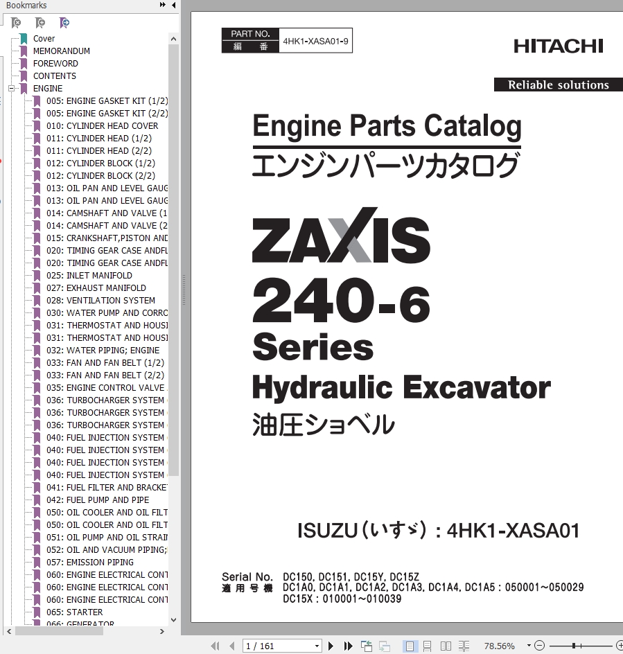 Hitachi ZX240-6 Series Engine Parts Catalog 4HK1-XASA01-9