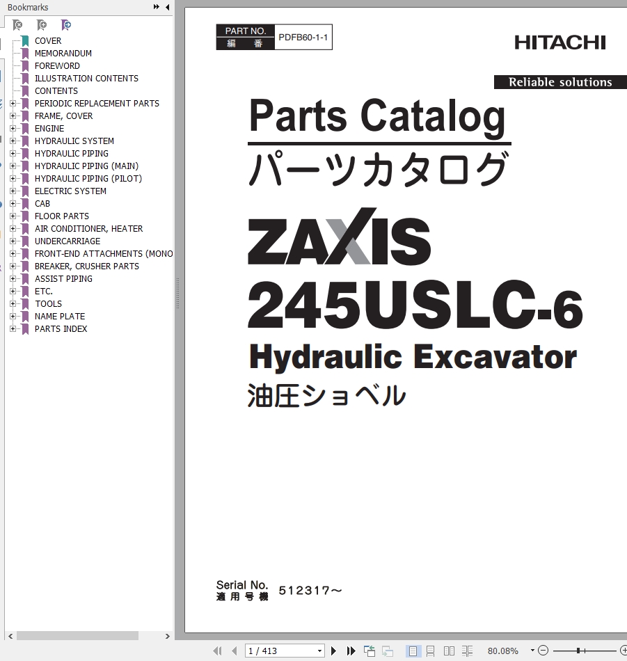 The Bookmarks of Hitachi ZX245USLC-6 Hydraulic Excavator Parts Catalog: