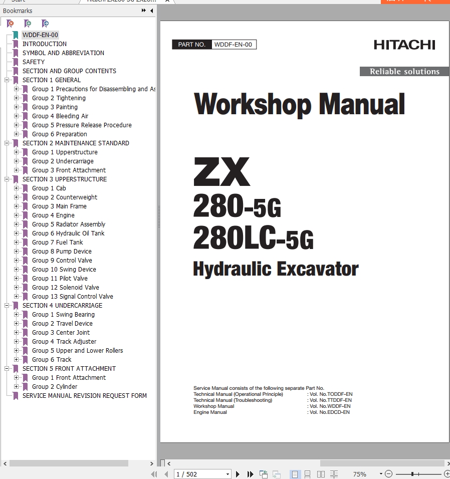 Hitachi ZX280-5G ZX280LC-5G Workshop Manual WDDF-EN-00