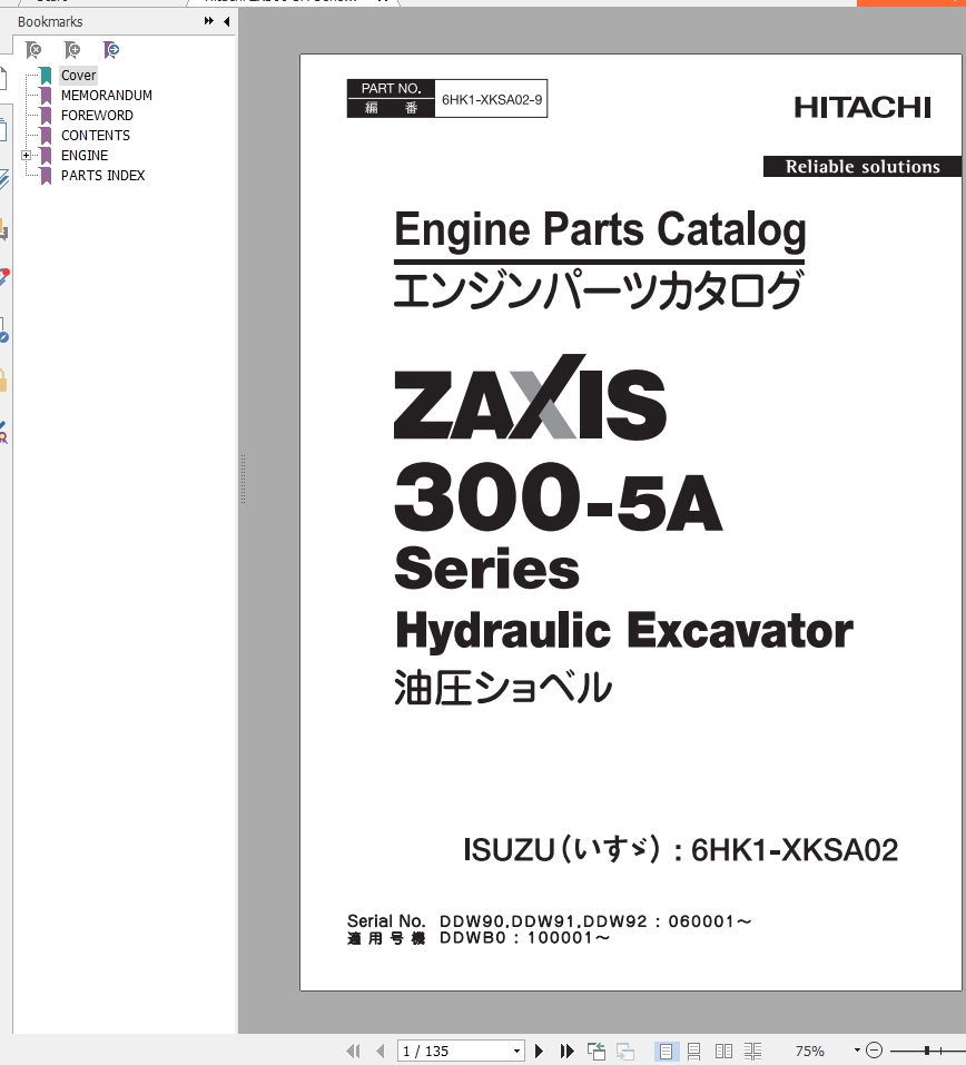 Hitachi ZX300-5A Series Engine Parts Catalog 6HK1-XKSA02-9