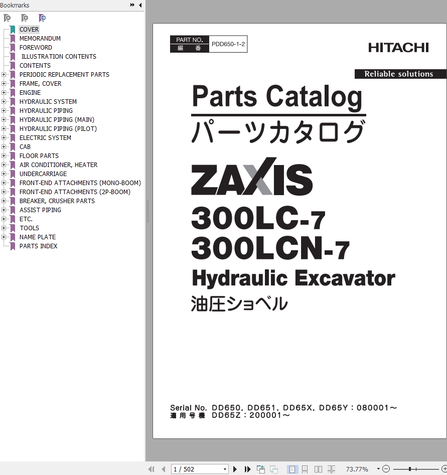 Hitachi ZX300LC-7 ZX300LCN-7 Parts Catalog PDD650-1-2
