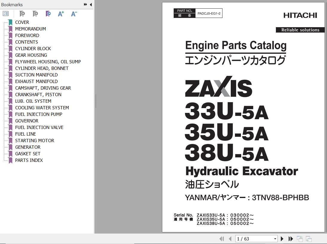 The Bookmarks of Hitachi ZX33U-5A 35U-5A 38U-5A Yanmar 3TNV88-BPHBB Engine Parts Catalog: