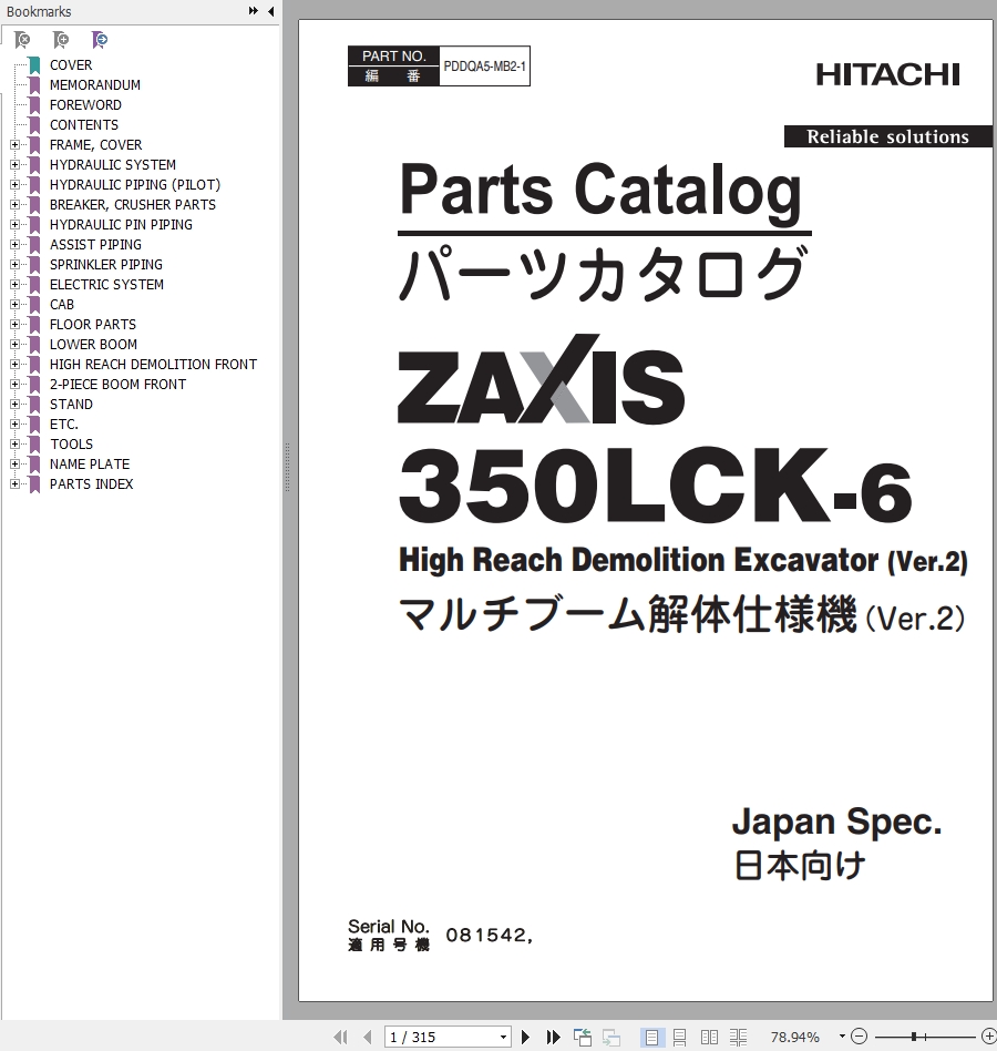 Hitachi ZX350LCK-6 Parts Catalog PDDQA5-MB2-1