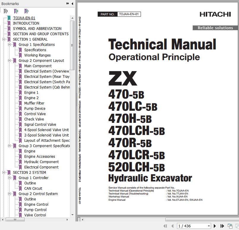 Hitachi ZX470-5A To ZX520LCH-5B Technical Operational Principle ManualTOJAA-EN-01(20160226) 440 Pages