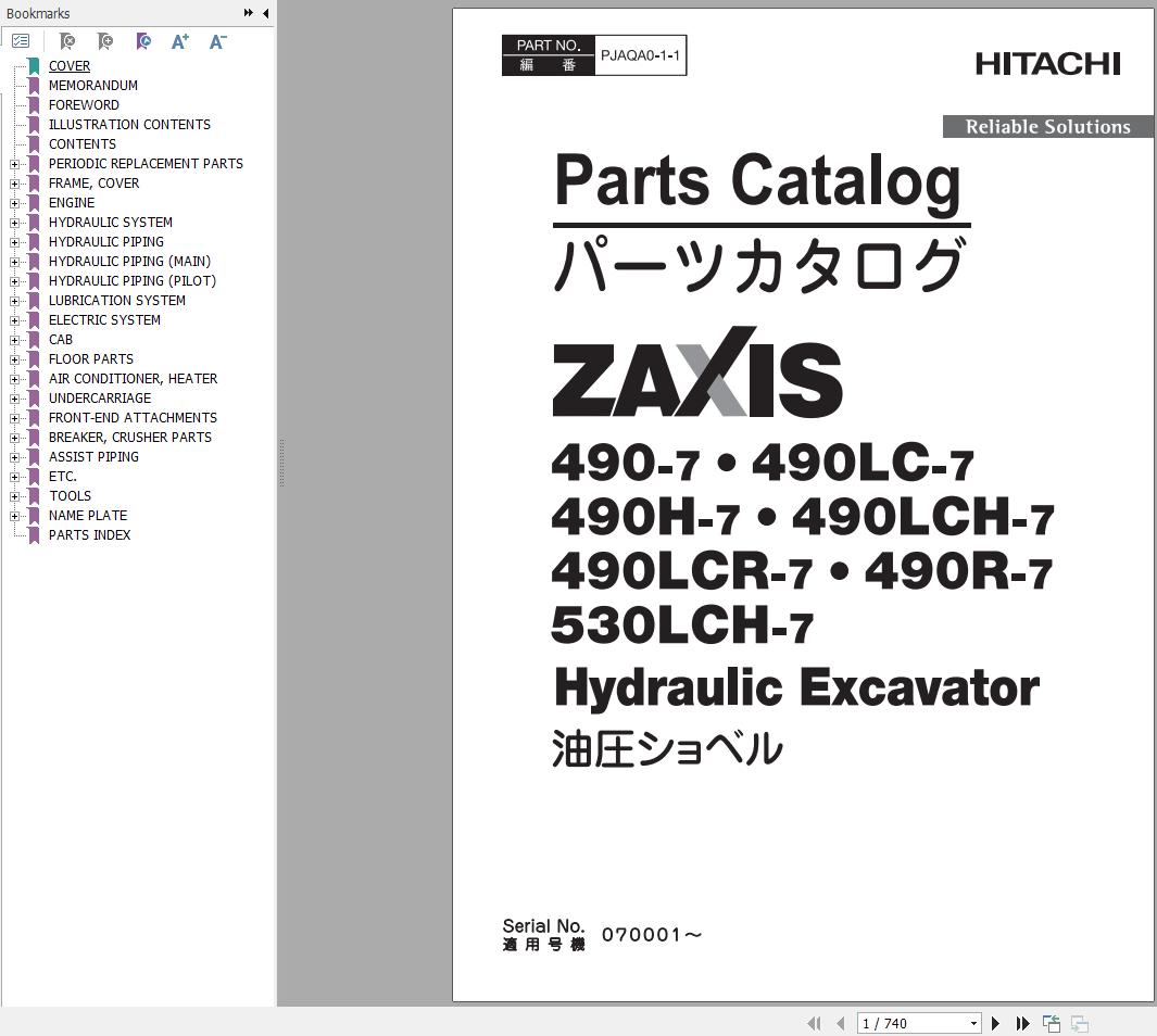 Hitachi ZX490-7 to ZX530LCH-7 Parts Catalog PJAQA0-E1-1 (740 Pages)