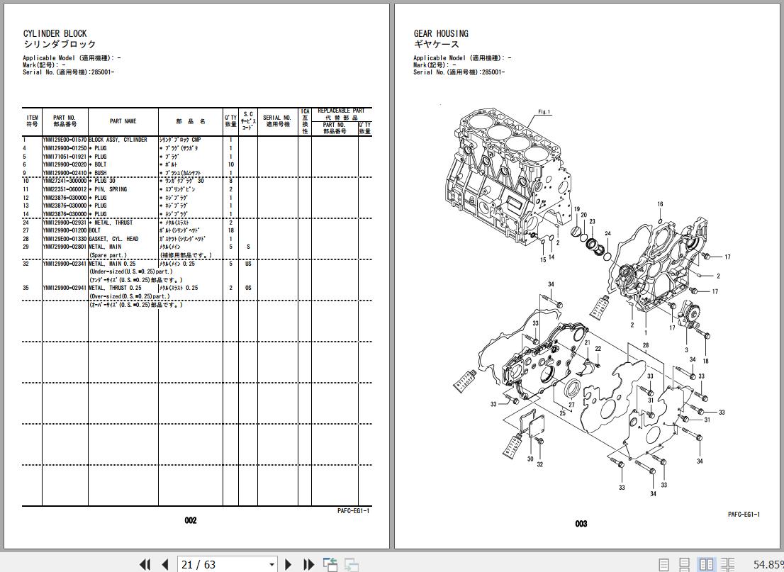 Hitachi ZX60USB-5N Yanmar 4TNV98C-WHB Engine Parts Catalog PAFC-EG1-1