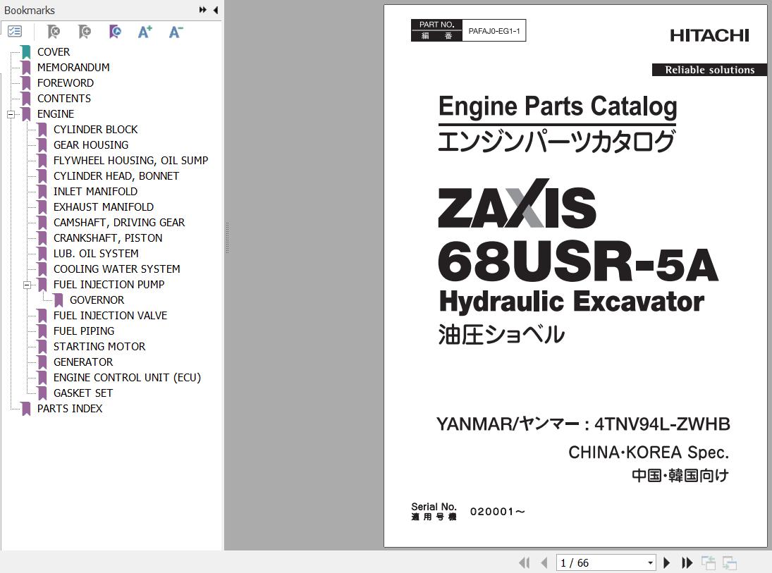 The Bookmarks of Hitachi ZX68USR-5A Yanmar 4TN94L-ZWHB Engine Parts Catalog: