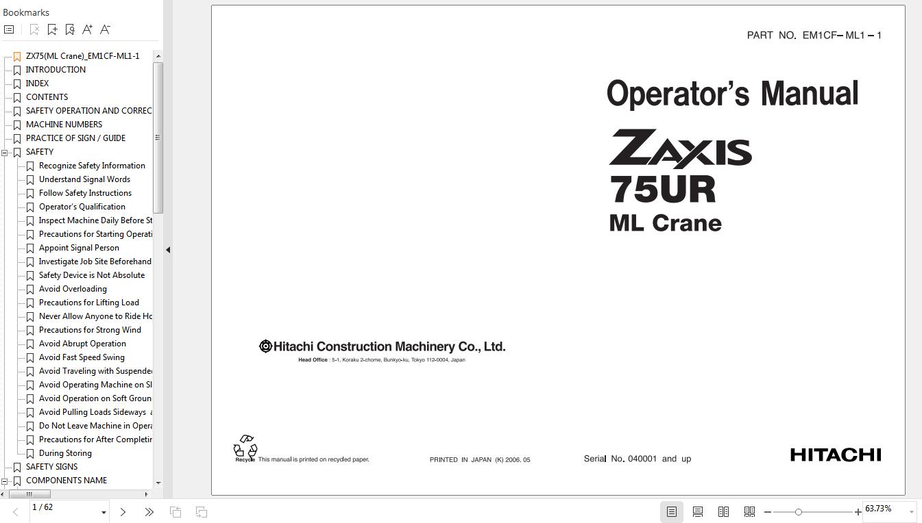 Hitachi ZX75UR ML Crane Operators Manual EM1CF-ML1-1