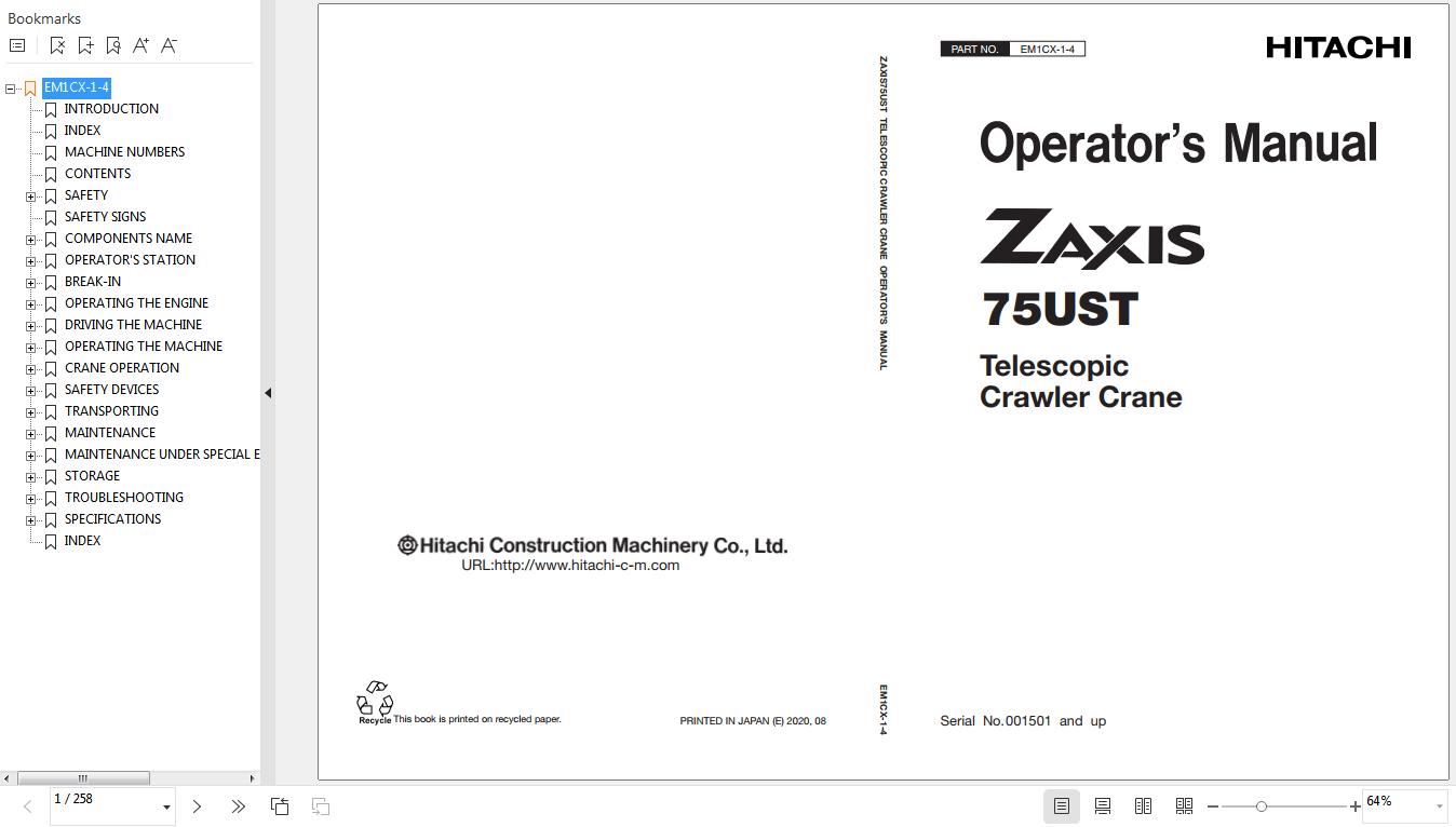 Hitachi ZX75UST Telescopic Crawler Crane Operator Manual EM1CX-1-4