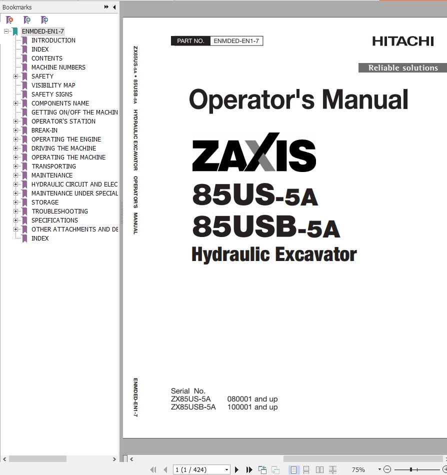 The Bookmarks of Hitachi ZX85US-5A ZX85USB-5A Hydraulic Excavator Operator's Manual: