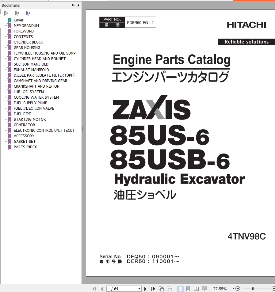 Hitachi ZX85US-6 ZX85USB-6 Engine Parts Catalog PDER50-EG1-2