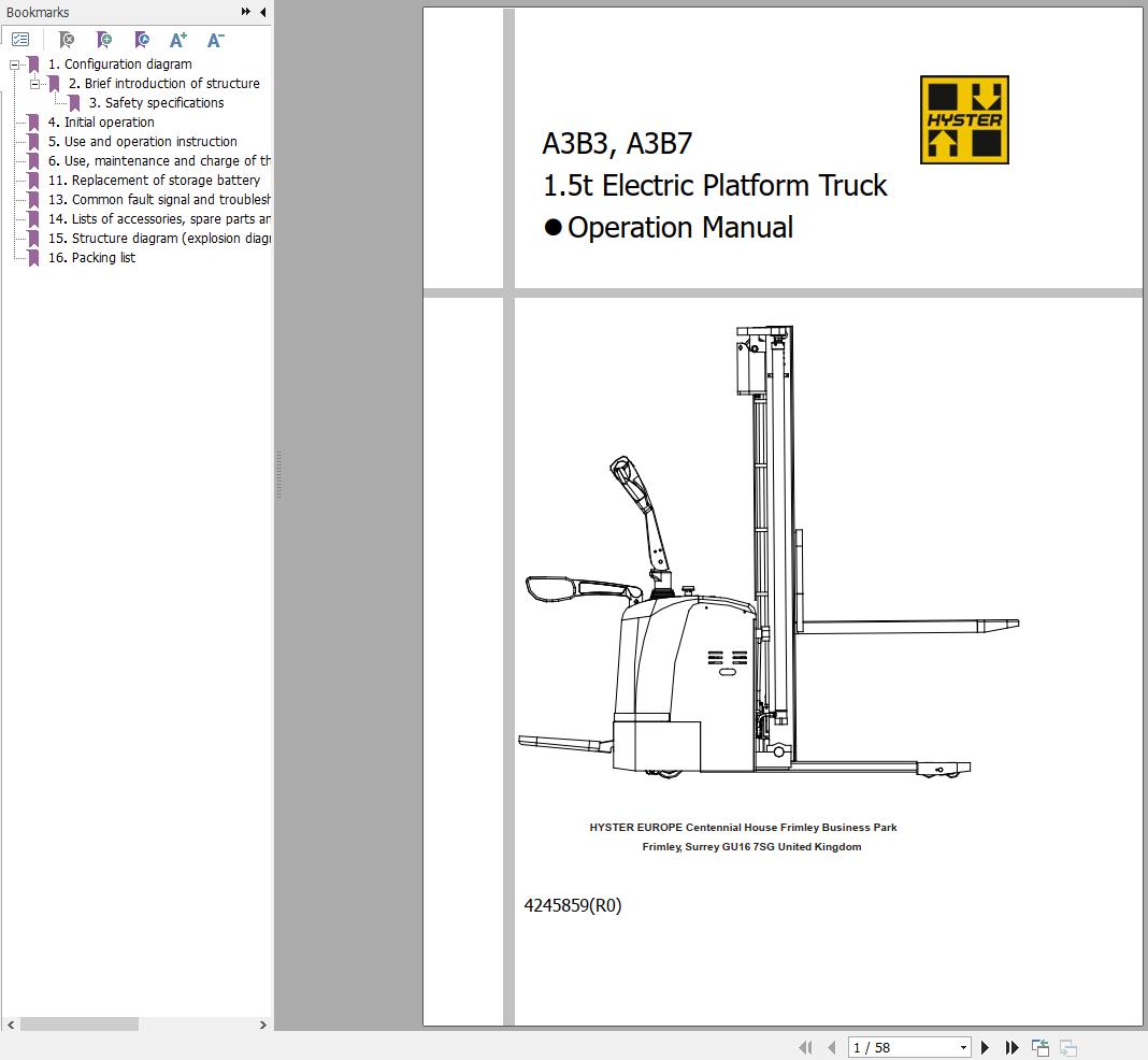Hyster S1.5-UTS (A3B3) SS1.5R-UT (A3B7) Operation Maintenance Manual 4245859