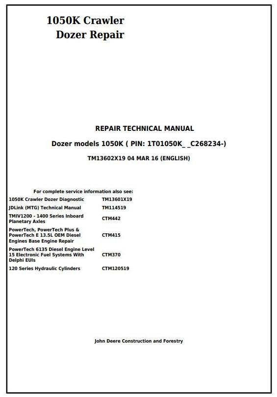 John Deere 1050K Crawler Dozer Repair Technical Manual TM13602X19