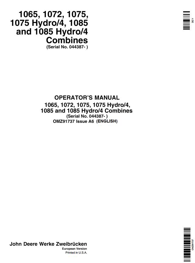 John Deere 1065 1072 1075 1075 Hydro4 1085 Operator's Manual OMZ91737