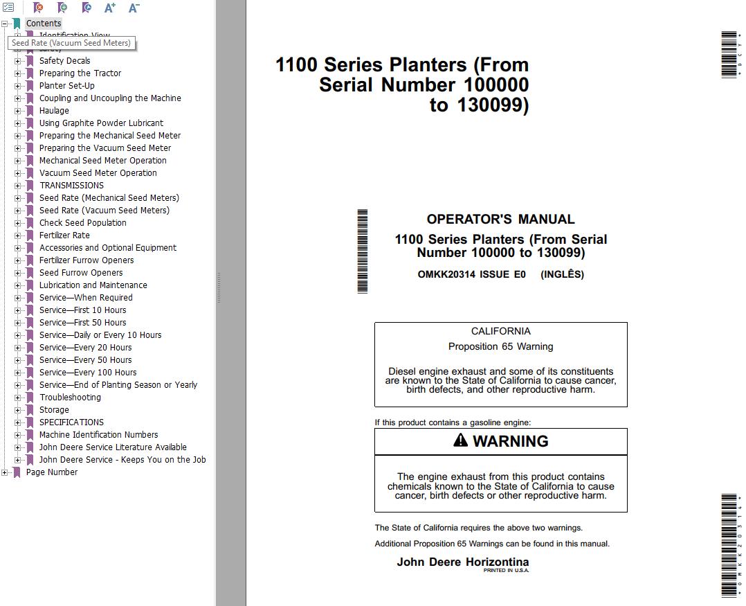 John Deere Planters 1100 Series Operator's Manual OMKK20314 (170 Pages)