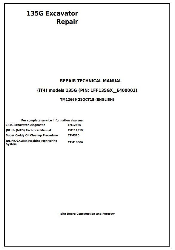 John Deere 135G Excavator Repair Technical Manual TM12669