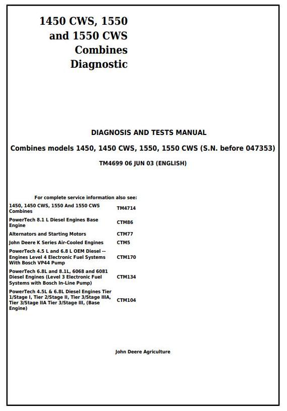 John Deere 1450 1450CWS 1550 1550CWS Combine Diagnosis Test Manual TM4699