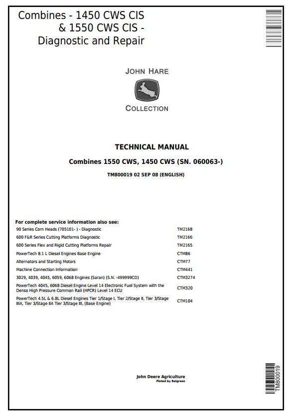 John Deere 1450CWS 1550CWS CIS Combine Diagnostic Repair Manual TM800019
