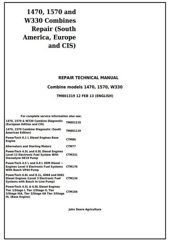 John Deere 1470 1570 W330 Combine Repair Technical Manual TM801319