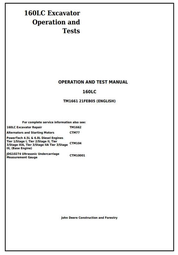 John Deere 160LC Excavator Operation Test Manual TM1661