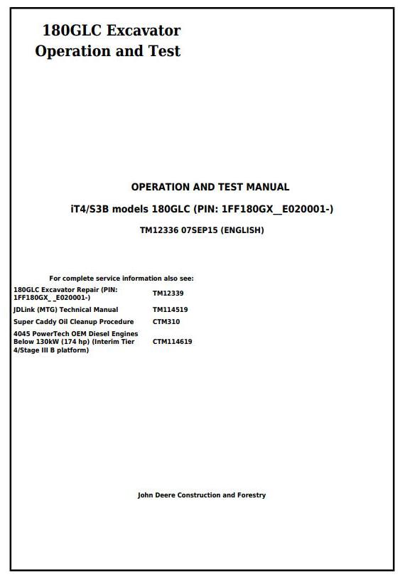 John Deere 180GLC Excavator Operation Test Manual TM12336