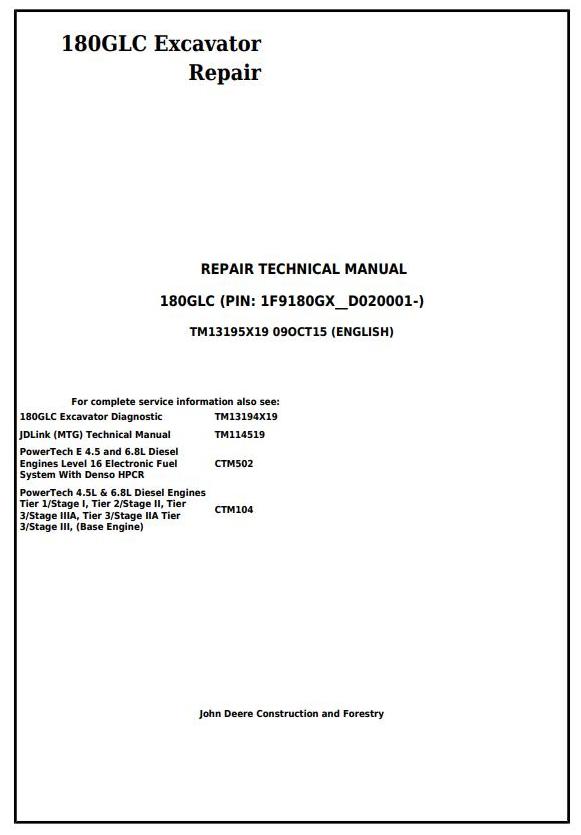 John Deere 180GLC Excavator Repair Technical Manual TM13195X19