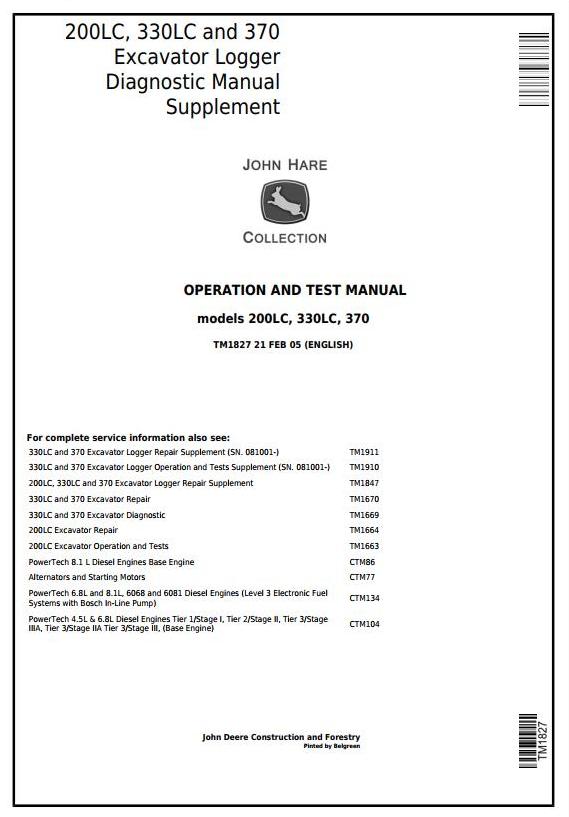John Deere 200LC 330LC 370 Excavator Logger Diagnostic Manual Supplement TM1827