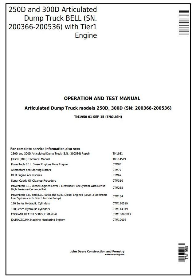 John Deere 250D 300D Articulated Dump Truck Operation Test Manual TM1950