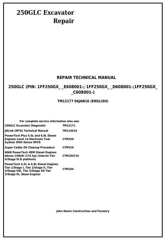 John Deere 250GLC Excavator Repair Technical Manual TM12177