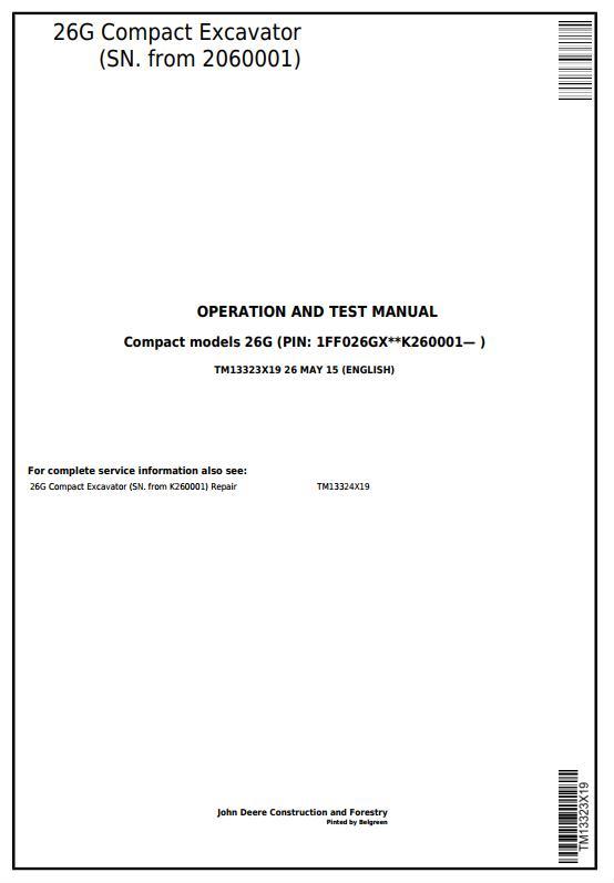 John Deere 26G Compact Excavator Operation Test Manual TM13323X19