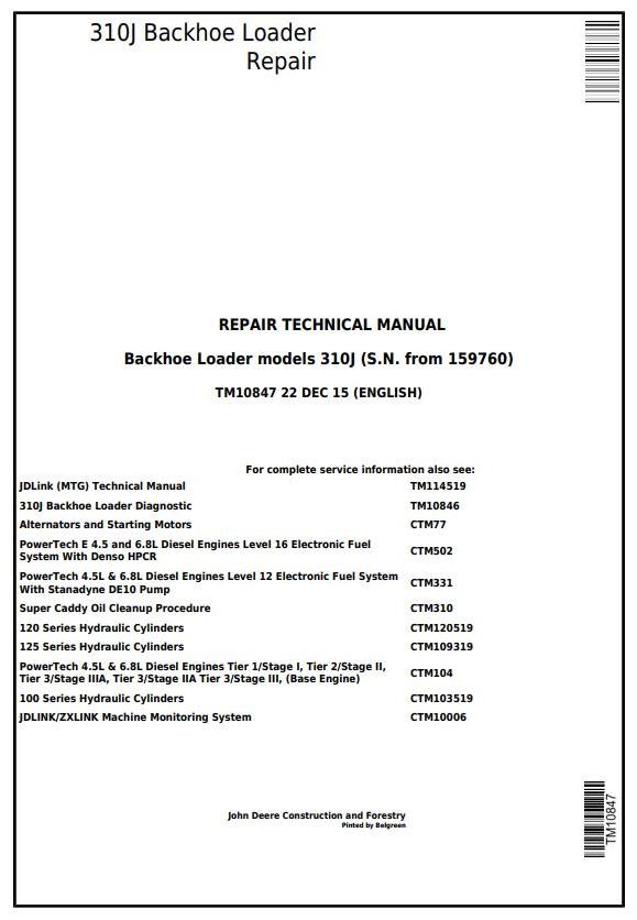 John Deere 310J Backhoe Loader Repair Technical Manual TM10847