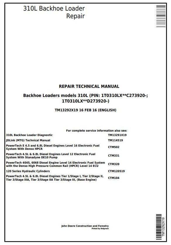 John Deere 310L Backhoe Loader Repair Technical Manual TM13292X19
