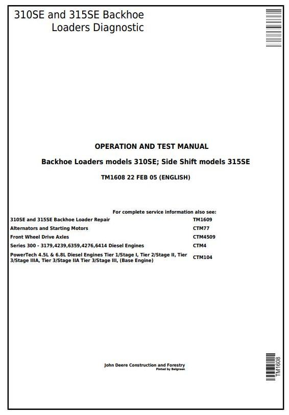 John Deere 310SE 315SE Backhoe Loader Side Shift Diagnostic Operation Test Manual TM1608