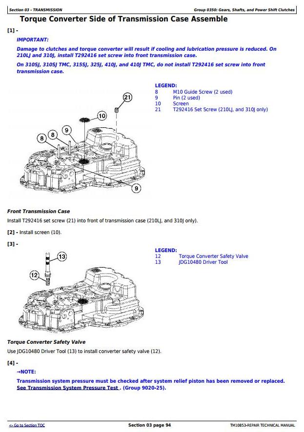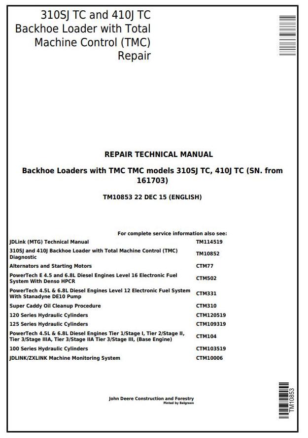 John Deere 310SJ TC 410J TC Backhoe Loader Repair Technical Manual TM10853