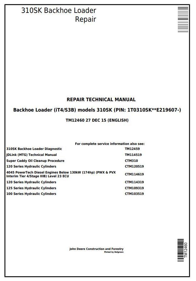 John Deere 310SK Backhoe Loader Repair Technical Manual TM12460