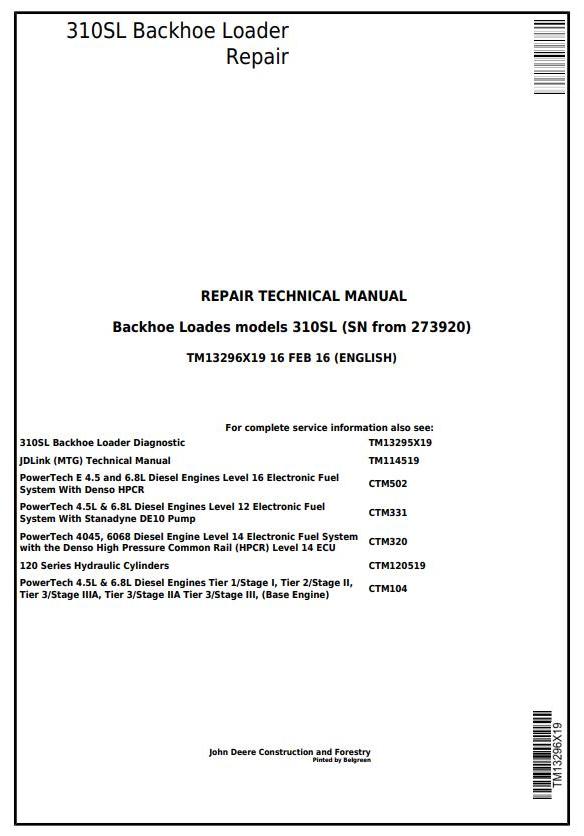 John Deere 310SL Backhoe Loader Repair Technical Manual TM13296X19