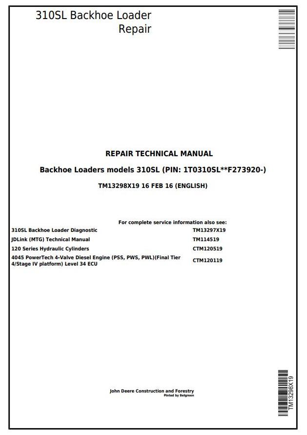 John Deere 310SL Backhoe Loader Repair Technical Manual TM13298X19