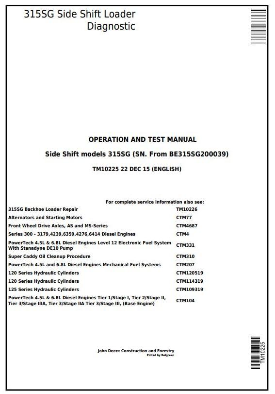 John Deere 315SG Side Shift Loader Diagnostic Operation Test Manual TM10225