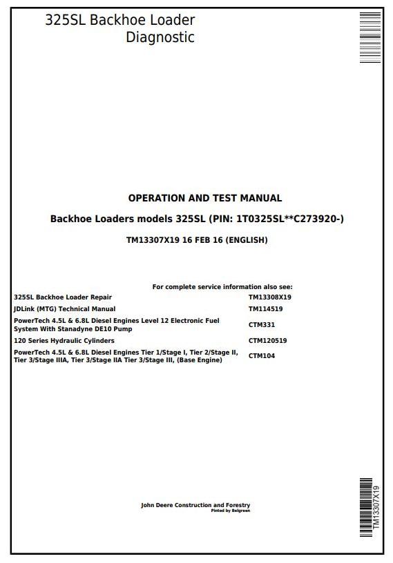 John Deere 325SL Backhoe Loader Diagnostic Operation Test Manual TM13307X19