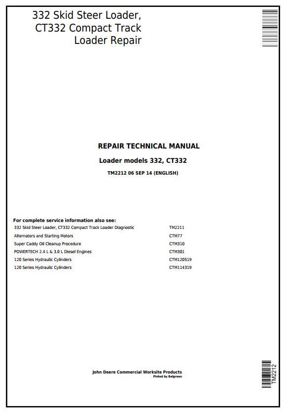 John Deere 332 CT332 Skid Steer Compact Track Loader Repair Technical Manual TM2212
