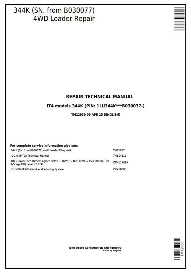 John Deere 344K 4WD Loader Repair Technical Manual TM12930