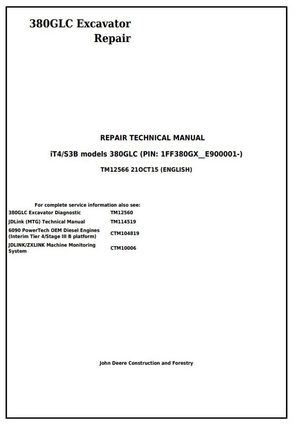 John Deere 380GLC Excavator Repair Technical Manual TM12566
