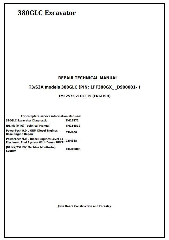 John Deere 380GLC Excavator Repair Technical Manual TM12575