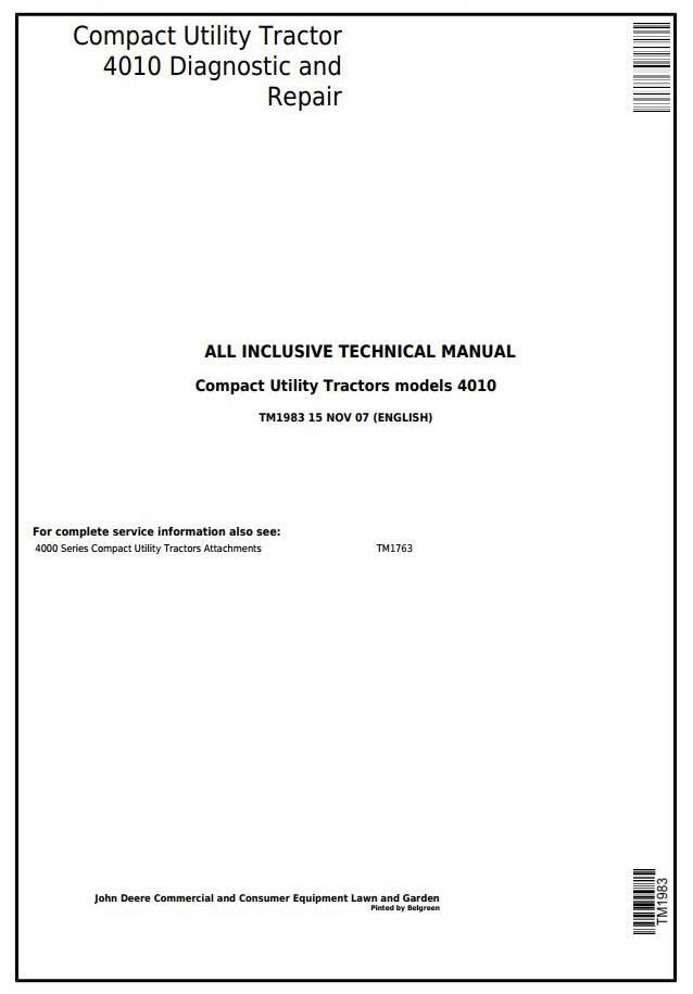 John Deere 4010 Compact Utility Tractor Diagnostic Repair Technical Manual TM1983