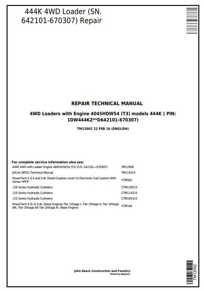 John Deere 444K 4WD Loader Repair Technical Manual TM12092