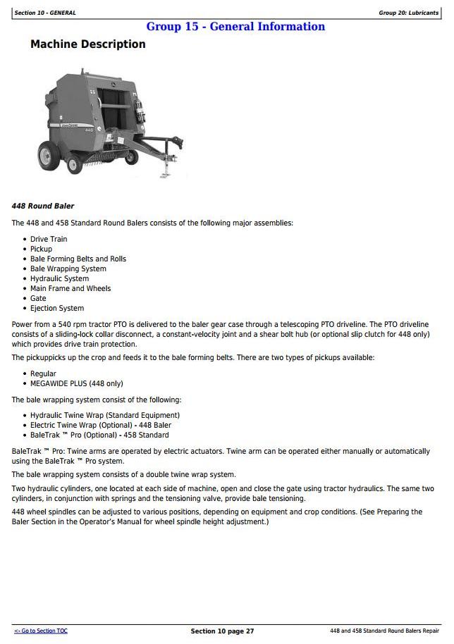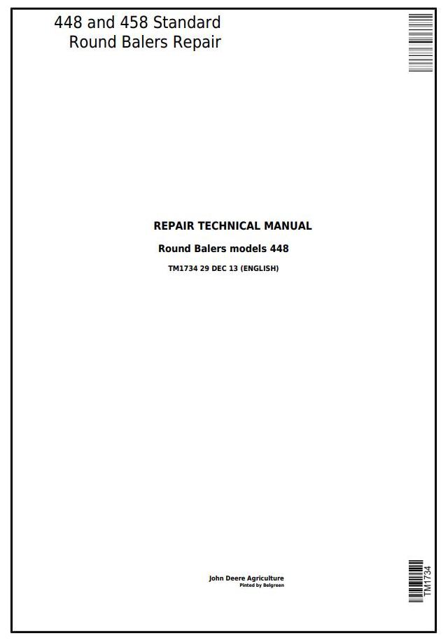 John Deere 448 458 Round Baler Repair Technical Manual TM1734