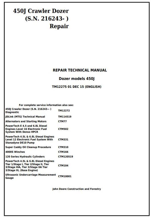 John Deere 450J Crawler Dozer Repair Technical Manual TM12275