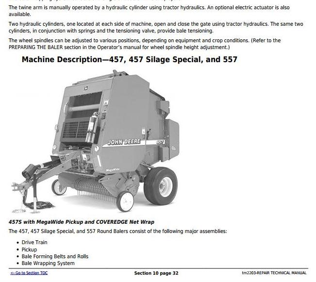 John Deere 457s 467s 447 457 467 547 557 567 Silage Special Round Balers Repair Technical Manual TM2203