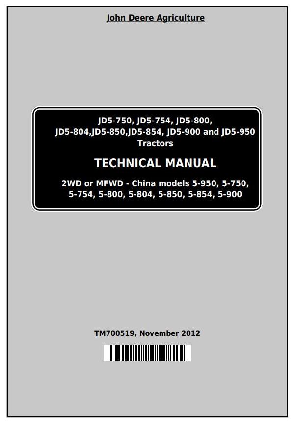 John Deere 5-750 5-754 5-800 5-804 5-850 5-854 5-900 5-950 Tractor Technical Manual TM700519